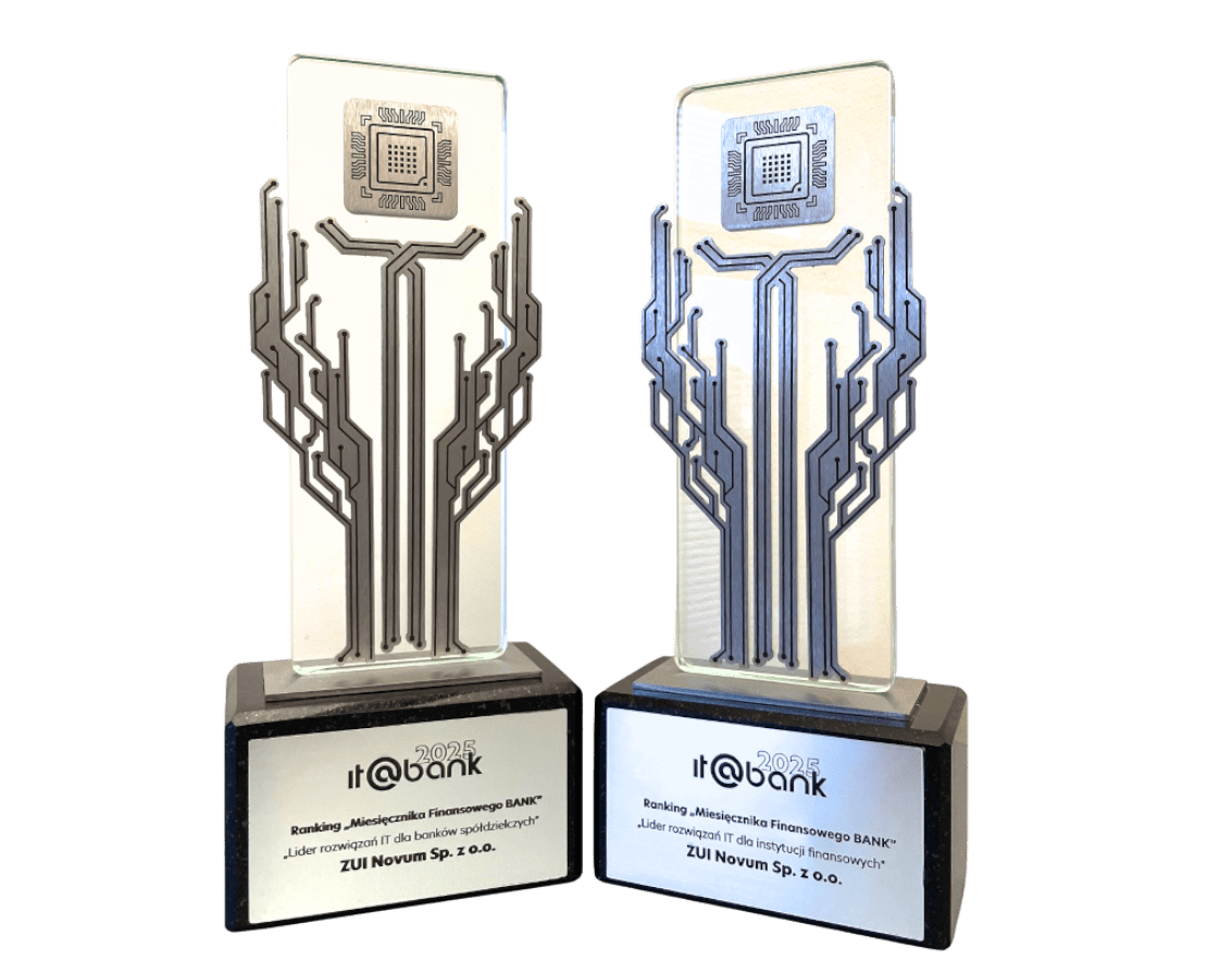 W XVI edycji Rankingu IT@BANK Firm Informatycznych Pracujących na Potrzeby Sektora Finansowego, realizowanego pod egidą Związku Banków Polskich oraz Miesięcznika Finansowego BANK, Zakład Usług Informatycznych NOVUM Sp. z o.o.  po raz kolejny zdobył tytuł Lidera wśród Firm Pracujących na Potrzeby Banków Spółdzielczych.